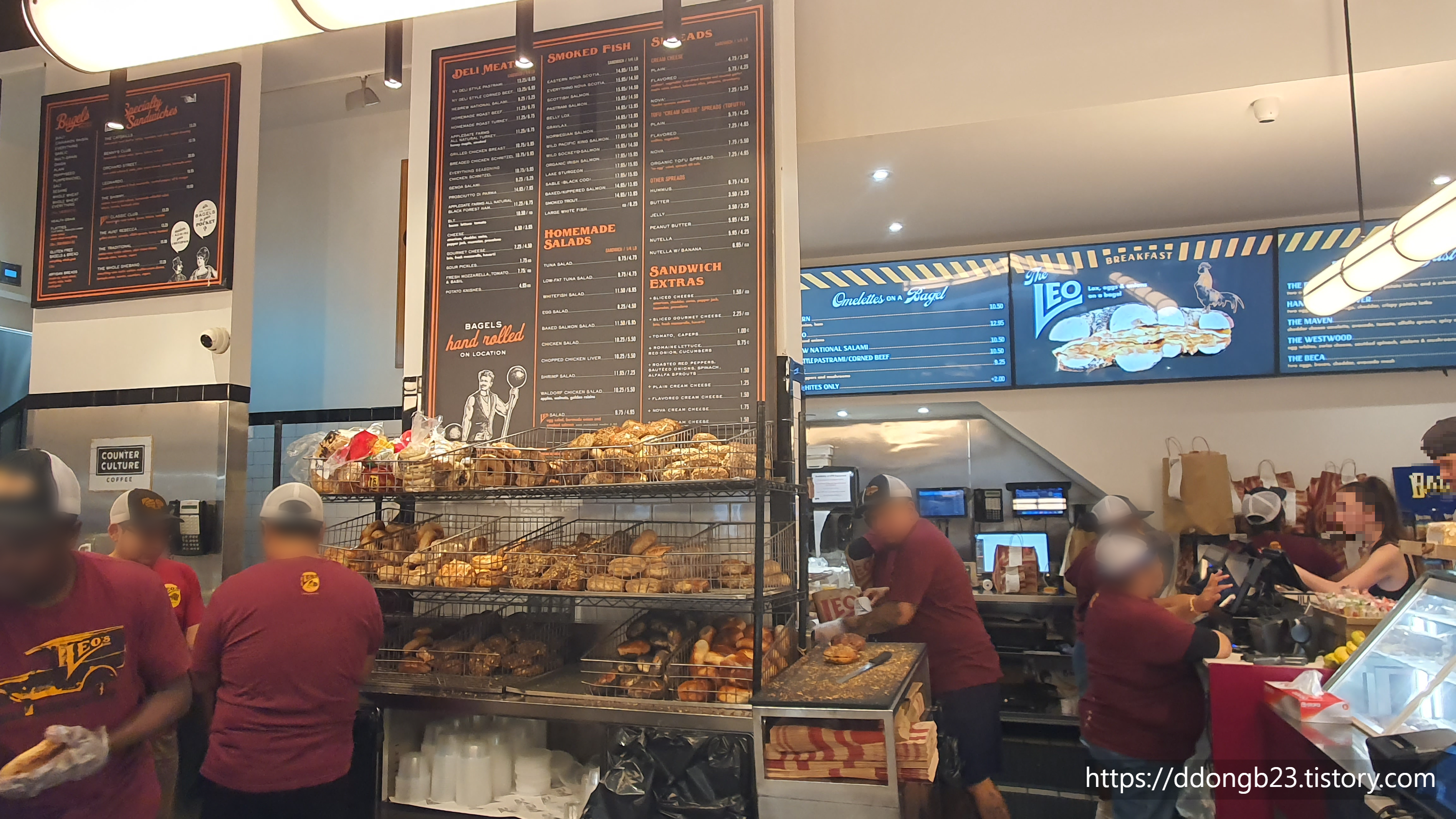 이곳은 다양한 베이글 종류와 스프레드를 판매하고 있어요. 매장 중앙에는 베이글을 굽고 샌드위치를 만들고 있어요. 줄 서서 기다리며 카운터에 다다랐을 때 주문하면 된답니다. 사람들이 어떤 메뉴를 많이 주문하는지 지켜봤죠.